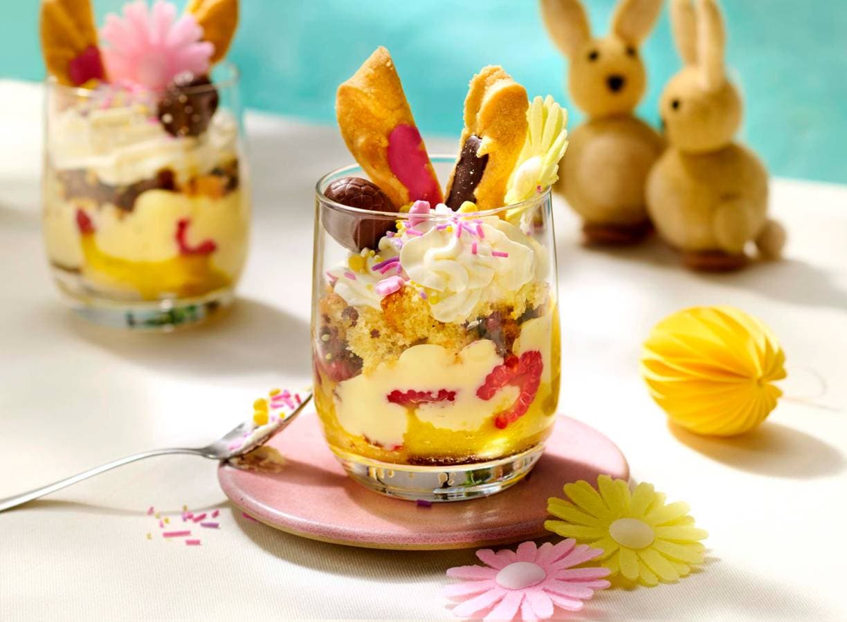 Deze mini-trifle schreeuwt gewoon ‘Pasen’. Je maakt ’m in een glaasje met zachte marmercake, zoete mango, frisse frambozen en luchtige slagroom.