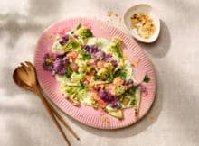 De bloemi in deze gezonde, glutenvrije salade met whipped geitenkaas wordt licht geroosterd, terwijl de romige geitenkaascrème met citroen, munt en peterselie zorgt voor frisheid. Lekker met knapperig amandelschaafsel en in 20 minuten op tafel.