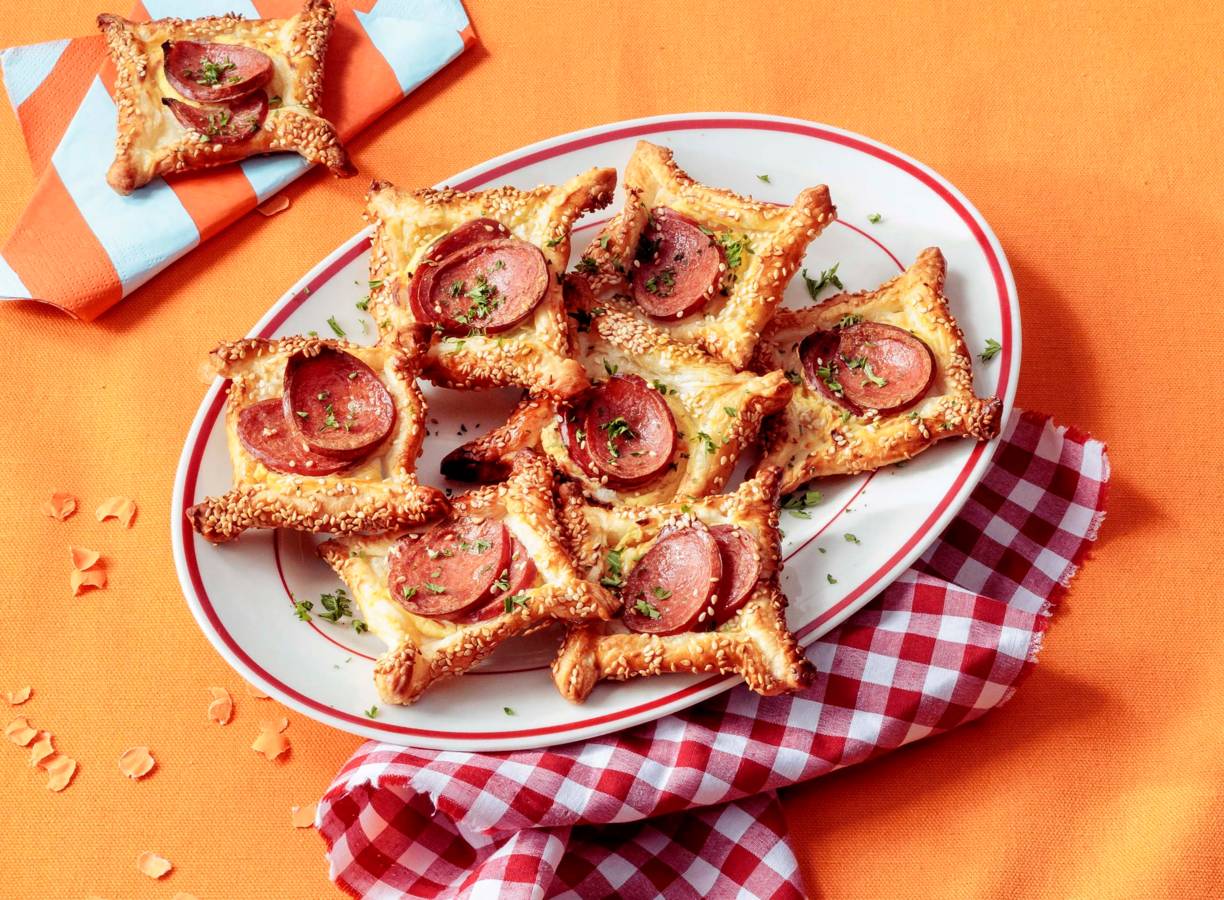Hartige bladerdeeghapjes met smeuïge mosterdspread en rookworst: snel voorbereid, feestelijk en zowel warm als koud lekker. Perfect voor op de borrelplank of als Koningsdaghapje.