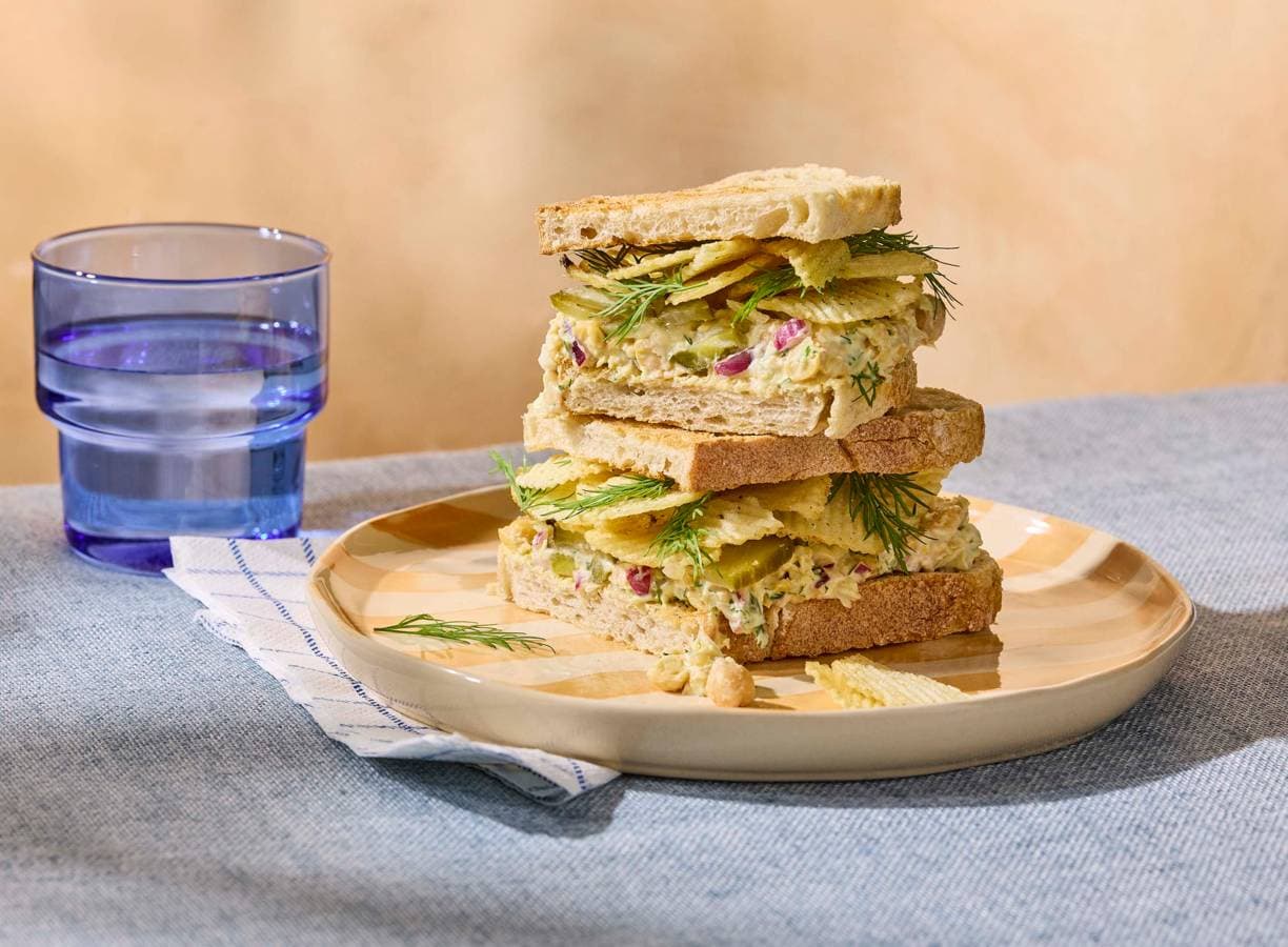 Rooster desembrood en vul het met romige kikkererwtensalade, zoetzure augurk en knapperige ribbelchips voor een vegetarische lunch boordevol smaak en crunch.