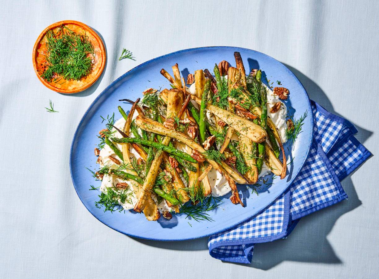 Verdeel de labneh over een platte schaal en verdeel de pastinaak en asperges erover. Bestrooi met de pecannoten en dille, besprenkel met de ahornsiroop en breng op smaak met peper.