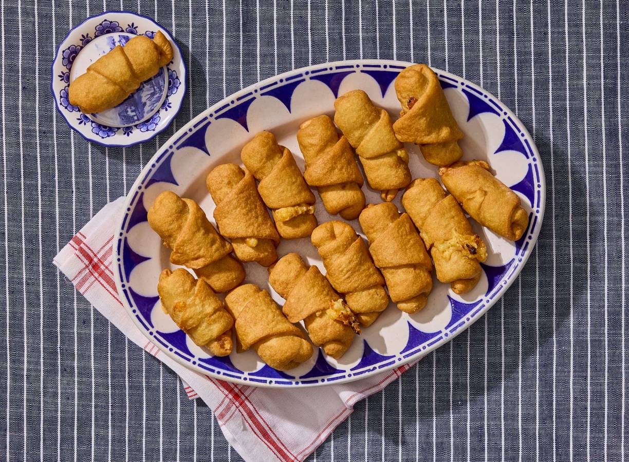 • achtergrondinfoThuiskok Raziye, Allerhande 2 2026. Diana: ‘Mijn moeder maakte voor feestjes altijd een grote voorraad. Ze wilde het een keer maken, maar ze had geen Turkse kaas in huis en de winkel was al dicht. Toen probeerde ze het maar met Nederlandse kaas en dat bleek verrassend lekker! Sindsdien doe ik dat vaker en dan voeg ik er ook nog uien aan toe. Ik ben eigenlijk benieuwd of meer Turkse mensen dit doen!’