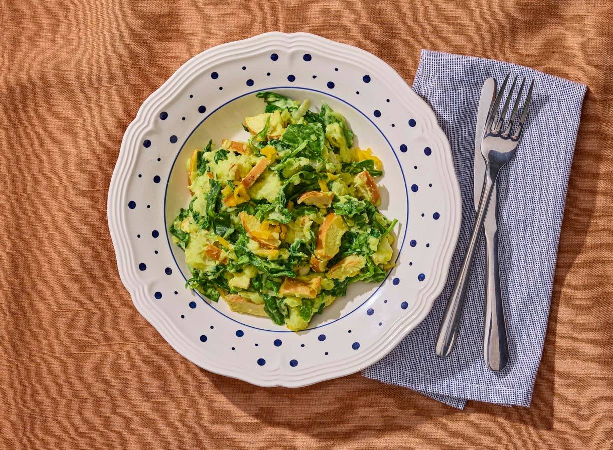 Spinazie-cassavestamppot met masala en gerookte kip van Hans