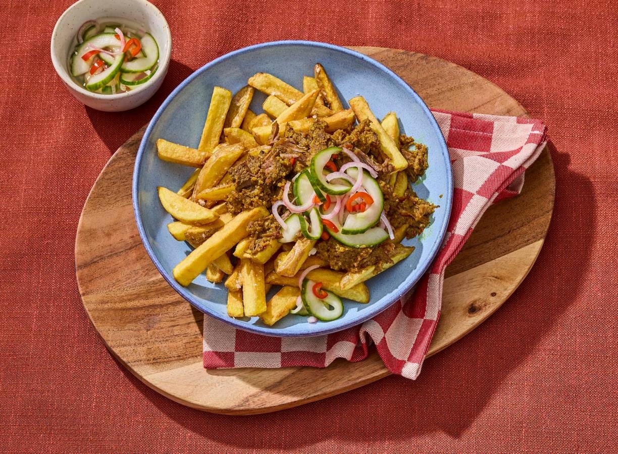 Geef het bekende ‘patatje met’ een Indonesische draai met langzaam gegaarde, kruidige rendang van rundvlees gekaramelliseerd in kokos en specerijen op goudbruine frietjes.
