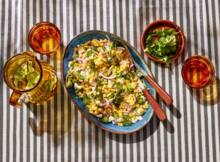 Meng de mais met de jalapeño, rode ui, avocado, limoendressing en de helft van de feta. Bestrooi met de koriander en de rest van de feta.