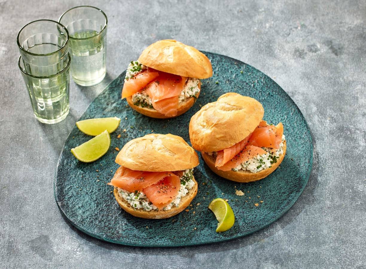 Dit broodje zalm heeft het allemaal: hüttenkäse, bieslook, peterselie en basilicum. Dat is een lunch om van te genieten!