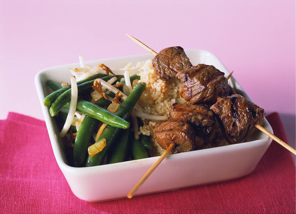 Bereid de couscous volgens de aanwijzingen op de verpakking. Pel de ui en snipper. Verhit olie in een wok en bak de ui ca. 2 min. Voeg de sperziebonen, taugé en marinade toe en bak ca. 3 min. Breng op smaak met peper en zout. Serveer de couscous met groenten en biefstukspiesen.