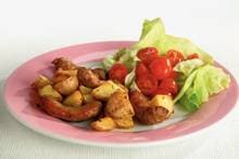 Oven voorverwarmen op 200 °C. Aardappelen schoonboenen en in parten snijden. In ovenschaal doen en mengen met rozemarijn, paprikapoeder en 3 el olie. Aardappelen in midden van oven in 35 min. gaarbakken. Af en toe omscheppen. Braadworst voorzichtig doormidden snijden en in lengte halveren. Braadworst na 15 min. door aardappelen scheppen en meebakken. Intussen sla schoonmaken en in stukken scheuren. Dressing roeren van rest van olie en azijn. Tomaatjes wassen en halveren. Sla mengen met tomaatjes en dressing. Aardappel-braadworstschotel serveren met salade.