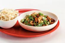 Mie volgens gebruiksaanwijzing koken. Spitskool schoonmaken en in reepjes snijden. Peultjes schoonmaken en in ruitjes snijden. In wok olie verhitten en tofu 3 min. bakken. Kool en peultjes toevoegen en 4 min. meebakken. Kerriesaus toevoegen en 1 min. meeverwarmen. Koriander fijnsnijden. Cashewnoten en koriander over saus strooien. Met mie serveren. Lekker met cassavekroepoek.