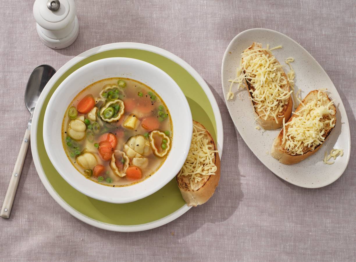 Verkruimel de bouillontablet boven de pan, schenk het water erbij en voeg de pastaschelpjes toe. Breng de soep aan de kook en laat zachtjes 8 minuten koken. Snijd de ciabtta in sneetjes. Bestrijk intussen de ciabatta dun met de rest van de olie.