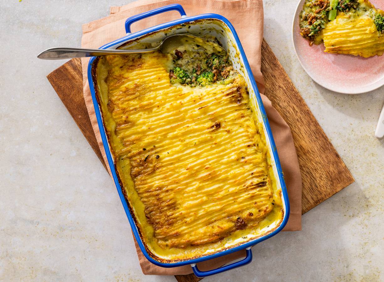 Verwarm de aardappelpuree volgens aanwijzingen op de verpakking. Verdeel het gehaktmengsel over de ovenschaal en schep de aardappelpuree erover. Strijk glad met een vork en bak 25 min. in de oven.