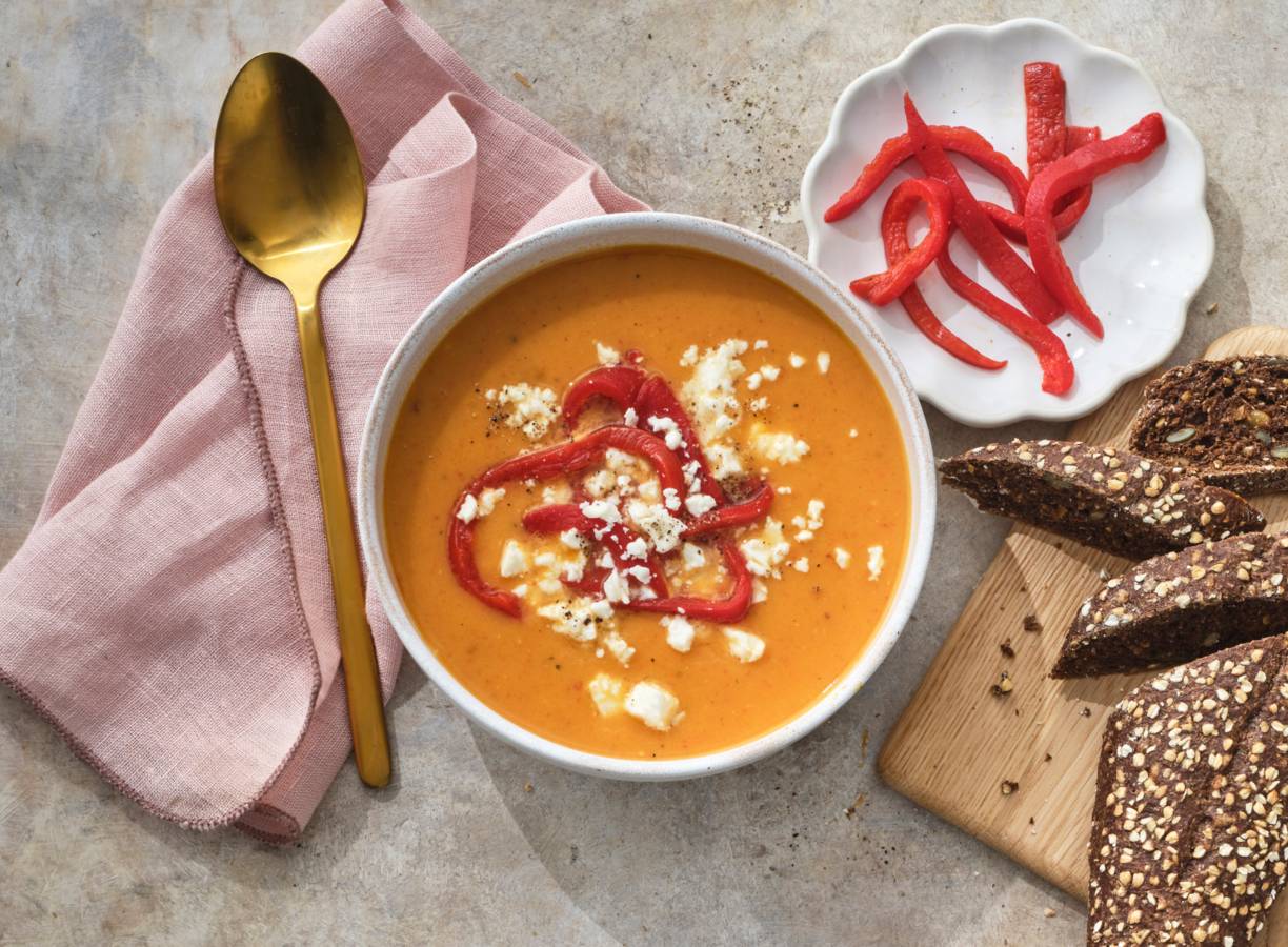 Schep de soep in de kommen. Verdeel de rest van de paprikareepjes erover en verkruimel de feta erboven. Serveer het brood bij de soep.