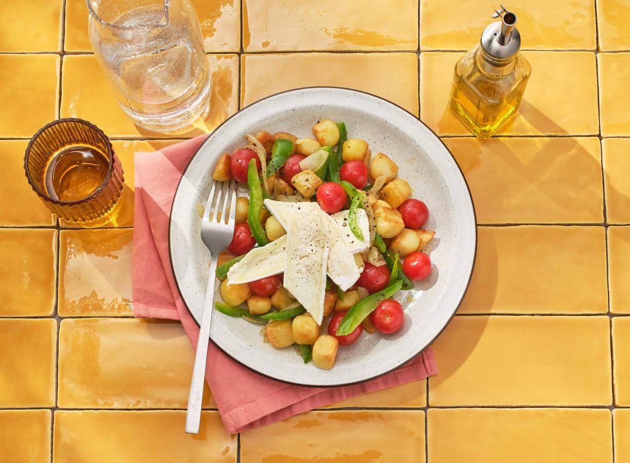 Tomaatjes wassen. Brie in plakken snijden. In braadpan 3 eetlepels olie verhitten. Krieltjes ca. 12 minuten bakken. Ui en paprika toevoegen en nog 3 minuten omscheppend bakken. Tomaatjes toevoegen en nog 2 minuten bakken. Klop een dressing van de rest van de olie met mosterd, zout en peper naar smaak. Dressing door aardappelmengsel scheppen. Salade over vier borden verdelen en brie erop leggen.