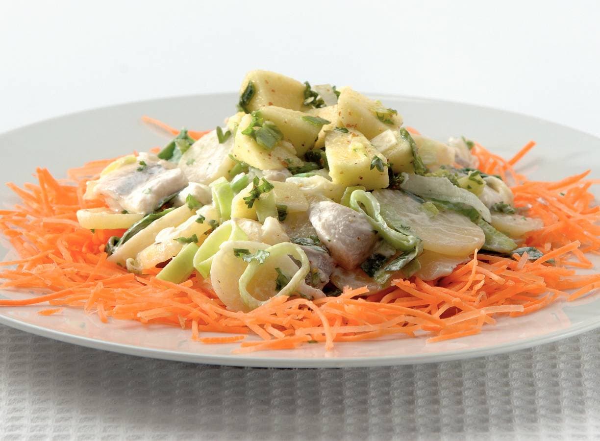 Aardappelschijfjes in ca. 10 min. gaarkoken. 250 g prei laatste min. meekoken. Afgieten en onder koude kraan koud spoelen. 50 g prei heel fijnsnijden. Peterselie fijnsnijden. Worteltjes over 4 grote platte borden verspreiden. Appel schillen, vruchtvlees in blokjes van 1/2 cm snijden. In schaal mengen met fijngesneden prei, helft peterselie, mosterd, azijn, suiker en olie. Roeren tot suiker is opgelost. Aardappel in ruime schaal mengen met prei, haring in roomsaus en rest peterselie. Salade in midden van wortels scheppen. Appelmengsel over wortel scheppen.