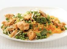 Rijst bereiden volgens aanwijzingen op verpakking. Doperwtjes in ruim kokend water met zout naar smaak in ca. 10 min. gaarkoken. Afgieten en terug in pan doen. Ondertussen blaadjes van munttakjes trekken. Kleine apart houden en grote in zeer smalle reepjes snijden. Apart houden. Bosuitjes, ook het groen, schuin in smalle ringen snijden. Olie in koekenpan verhitten. Hierin helft bosuitjes 2 min. bakken. Helft taugé en muntreepjes 1 min. meebakken. Aan doperwtjes toevoegen. Tilapia in stukjes verdelen en met saus door doperwtjes scheppen en 2 min. doorwarmen. Naar smaak zout en peper toevoegen. Rest taugé, bosuitjes en muntblaadjes erdoor mengen. Rijst over 4 borden verdelen. Tilapia met dorperwtjes erop scheppen en met taugémengsel bestrooien.