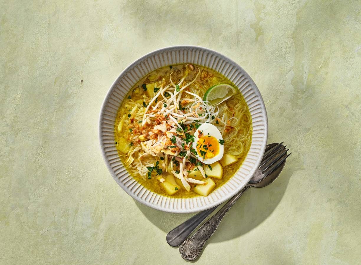 Indonesische soto, maar dan zelfgemaakt! Een rijke kippenbouillon met verse kruiden, pandanrijst, taugé en gekookte eieren. Serveer alles los, zodat iedereen zijn eigen kom kan samenstellen.
