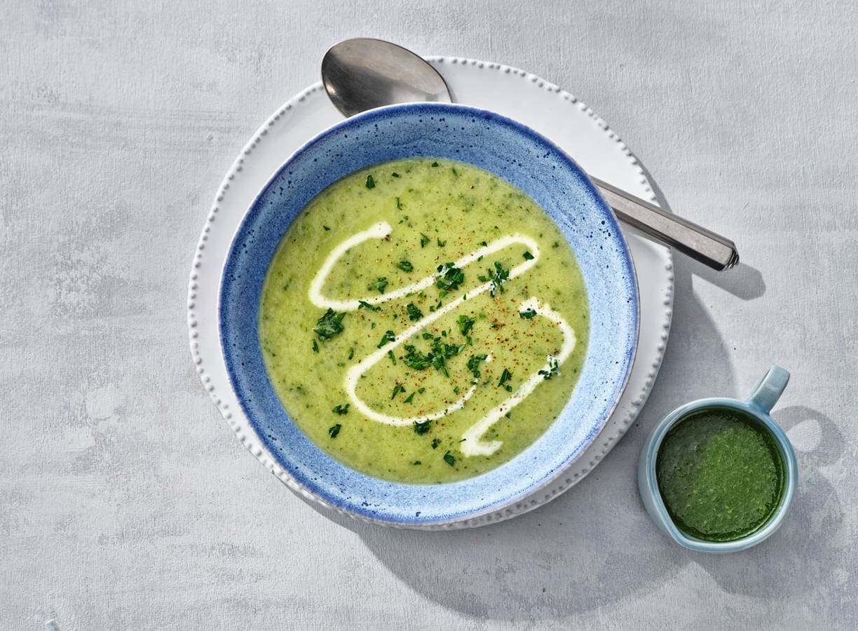- bereidingstipJe kunt ook een kruidenolie maken in plaats van de kruiden door de soep te roeren: doe de peterselie- en muntblaadjes en 50 ml extra vierge olijfolie in de hoge beker van een staafmixer en pureer tot een gladde groene olie. Voeg eventueel meer olijfolie toe.