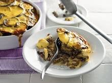 Spreid de helft van de aardappelplakjes uit in de ovenschaal. Schep de helft van het gehakt erop. Leg de helft van de aubergineplakken op het gehakt. Herhaal deze volgorde nog een keer.