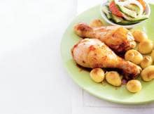 Verdeel de krieltjes over 4 borden. Leg de kip erbij en serveer met de salade.