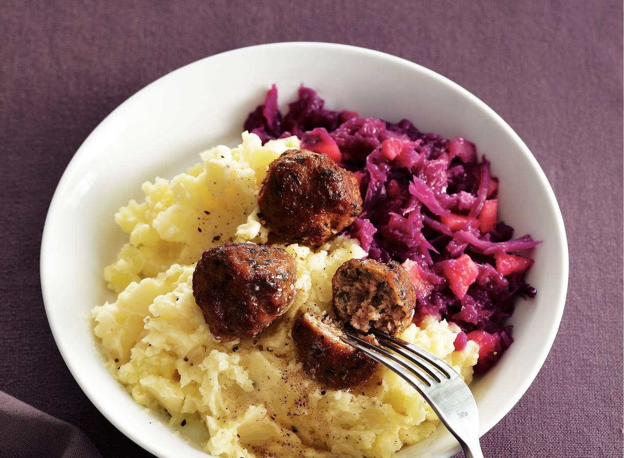 Verdeel de gehaktballetjes, puree en rodekool over 4 borden.