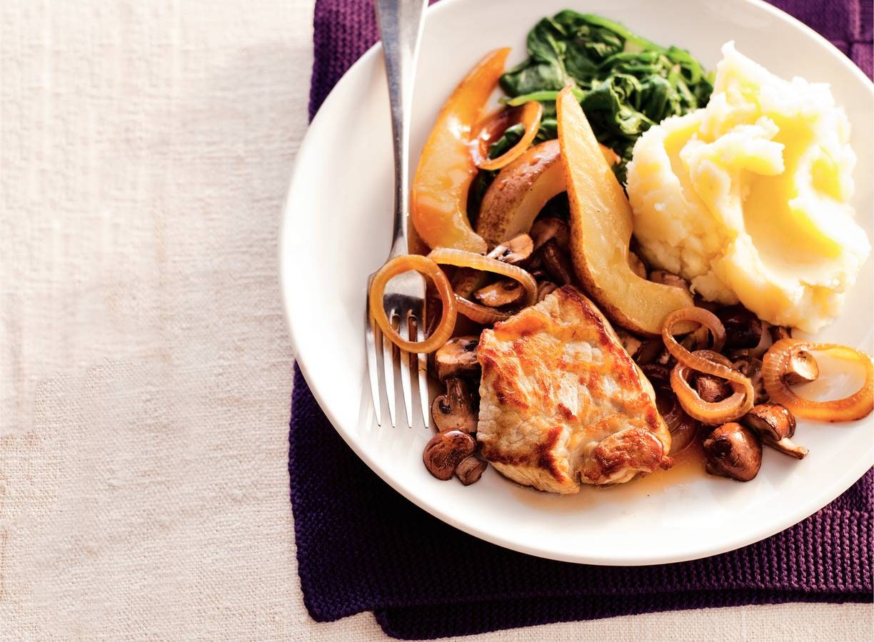 Schil de aardappelen en kook ze in water met zout in 20 min. gaar. Bestrooi ondertussen het vlees met peper en zout. Verhit 20 g boter in een koekenpan en bak het vlees op hoog vuur in 2 min. bruin. Keer halverwege. Neem uit de pan. Bak de ui 2 min. in dezelfde pan. Voeg de champignons toe en bak 5 min. mee. Snijd de peer in kwarten, verwijder het klokhuis en snijd de kwarten in plakken. Voeg met het sap toe aan de ui en champignons. Leg het vlees terug in de pan en laat 6 min. stoven zonder deksel.