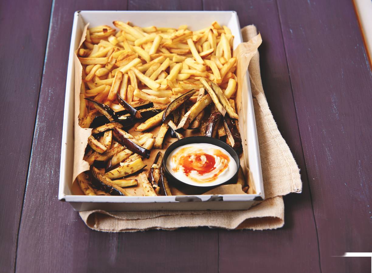 Verwarm de oven voor op 220 °C. Snijd de aubergine in de lengte in plakken. Snijd deze in dikke frites van 8 cm lang. Verdeel ze over de helft van een met bakpapier beklede bakplaat. Verdeel de ovenfrites over de andere helft.