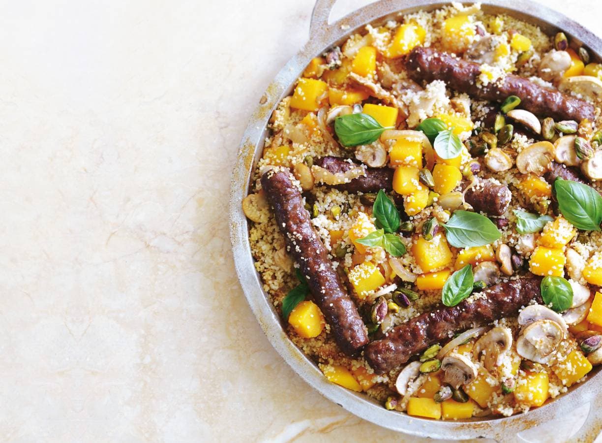 Verhit de olie in een koekenpan. Bak de chipolata in 3 min. bruin. Voeg de ui en de champignons toe en bak 4 min. Haal van het vuur en schep de bevroren pompoenblokjes, couscous en de pistachenoten erdoor. Vet de ovenschaal in. Doe dit mengsel in de ingevette ovenschaal en schenk de hete bouillon erover. Zorg dat de couscous helemaal onderstaat, is dit niet het geval schenk er dan kokend water bij.