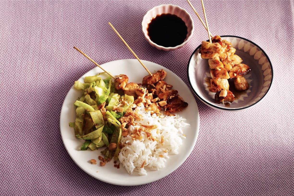 Verhit de rest van de olie en bak de saté 5 min. Keer halverwege. Verdeel de saté, rijst en kool over 4 borden. Voeg naar smaak nog wat ketjap aan de saté toe. Bestrooi het gerecht met de pinda's en uitjes.