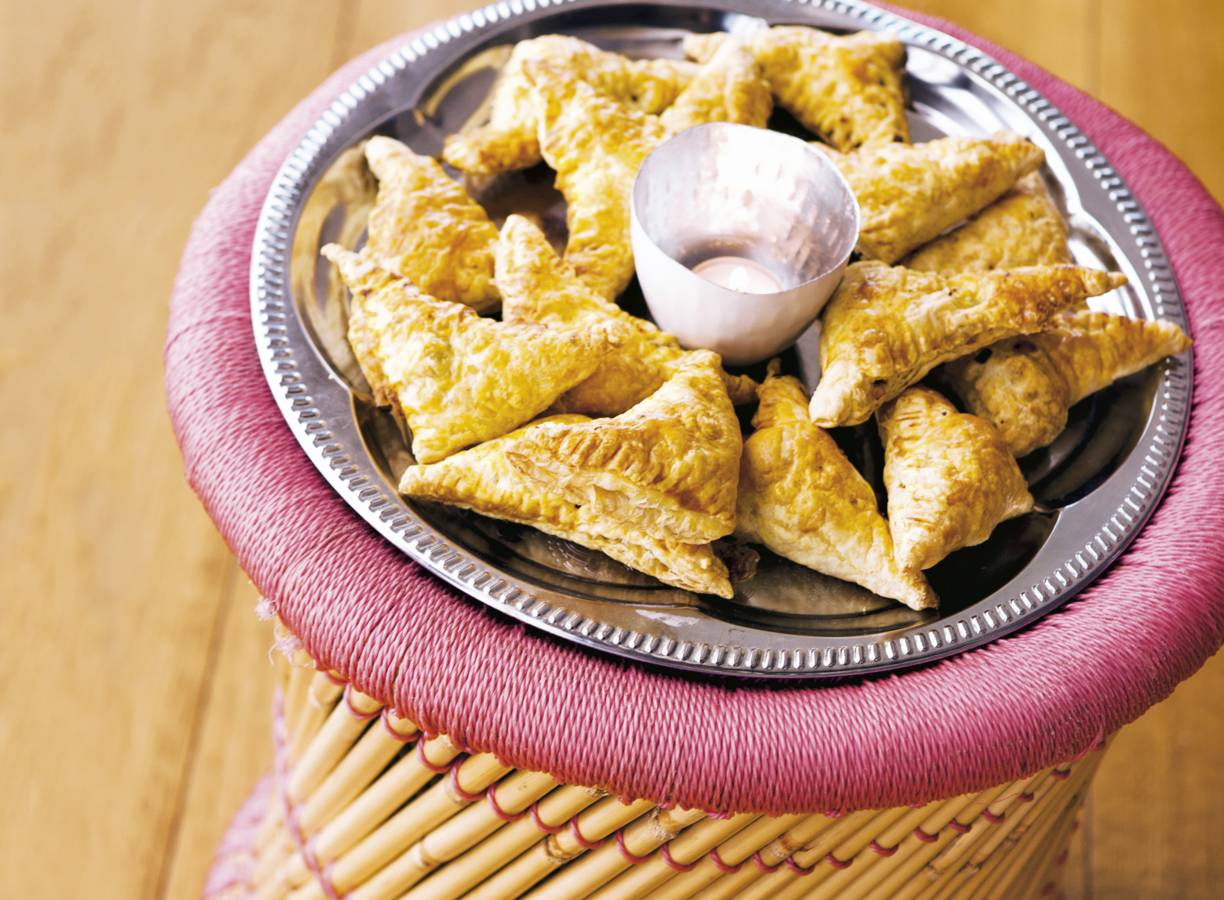 Klop het ei los. Snijd het bladerdeeg diagonaal doormidden. Verdeel het mengsel erover. Bestrijk de randen met water en vouw tot een driehoekje. Duw de randen aan met de tanden van een vork. Bestrijk de driehoekjes met het ei.