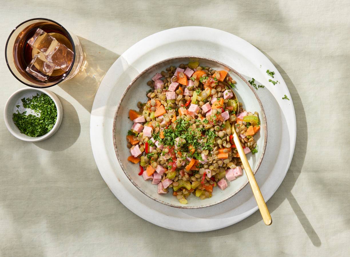 In roerbakpan olie verhitten. Ui, bleekselderij, wortel en knoflook ca. 5 minuten bakken. Afblussen met wijn. Linzen afgieten en met peper en tomaten aan gebakken groenten toevoegen. Beetje water en laurierblaadje toevoegen en afgedekt in ca. 40 minuten laten garen. Ham in blokjes snijden en tot slot met peterselie door linzen roeren. Op smaak brengen met zout en peper.