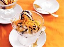 Pers een 1/2 sinaasappel uit, voeg het sap toe aan het suikerwater en laat tot de helft inkoken. Neem van het vuur. Laat de chocolade in het suikerwater smelten. Schep in elke coupe 2 bollen ijs en schenk de saus erover. Bestrooi met de sinaasappelreepjes.