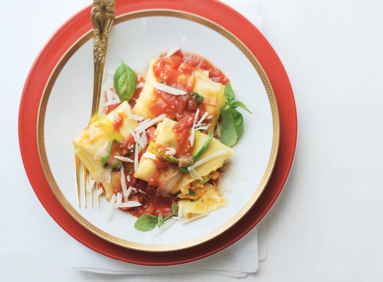 Neem met een schuimspaan uit de pan. Leg er 3 op elk bord. Schep de saus erover. Garneer met basilicum en eventueel extra kaas. Lekker met broccoli met noten (recept op ah.nl/allerhande).