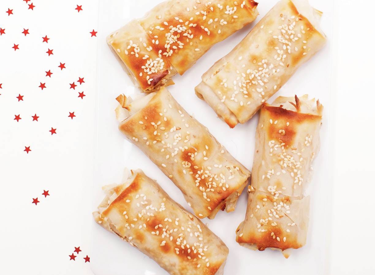 Smelt de boter in een steelpan. Bestrijk met de bakkwast 1 vel filodeeg met gesmolten boter. Neem 1/2 el sesamzaad en strooi er iets van over het deeg. Vouw dubbel, bestrijk weer met boter en bestrooi weer met sesamzaad. Leg het vel met de korte kant naar je toe. Leg een reep vis aan het begin en vouw het filodeeg aan weerszijden een stukje over de vis. Rol het deeg met de vis op van beneden naar boven, als een loempia. Bestrijk met boter en bestrooi met sesam. Maak zo nog 7 vissticks. Leg ze op een met bakpapier beklede bakplaat. Bak ze in ca. 15 min. in het midden van de oven goudbruin.