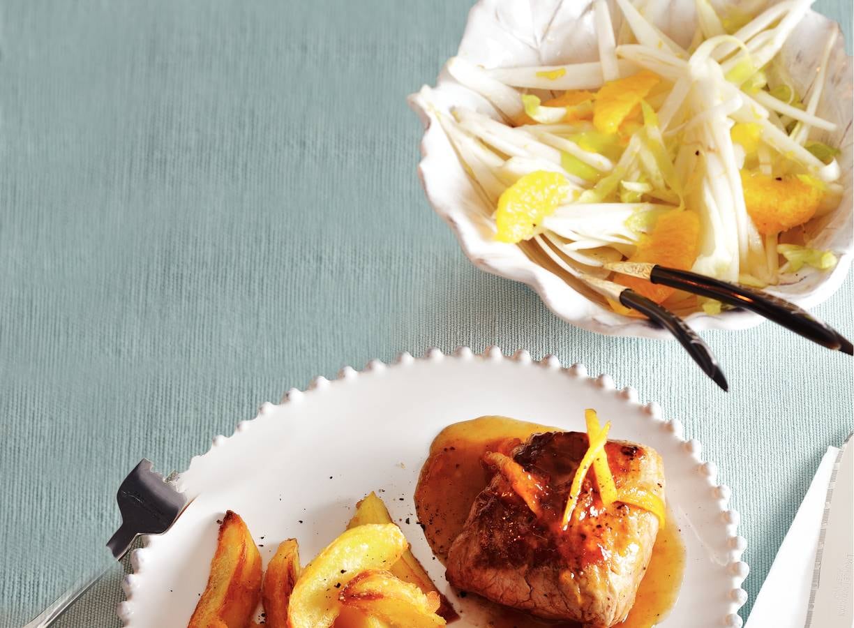 Verdeel de varkenshaas in 4 porties. Verhit de boter in een koekenpan en bak het vlees in 2 min. rondom bruin op hoog vuur. Zet het vuur lager en voeg de marmelade en 4 el water toe. Bak het vlees nog 5 min. in de marmeladejus. Serveer met de aardappelen en witlofsalade.