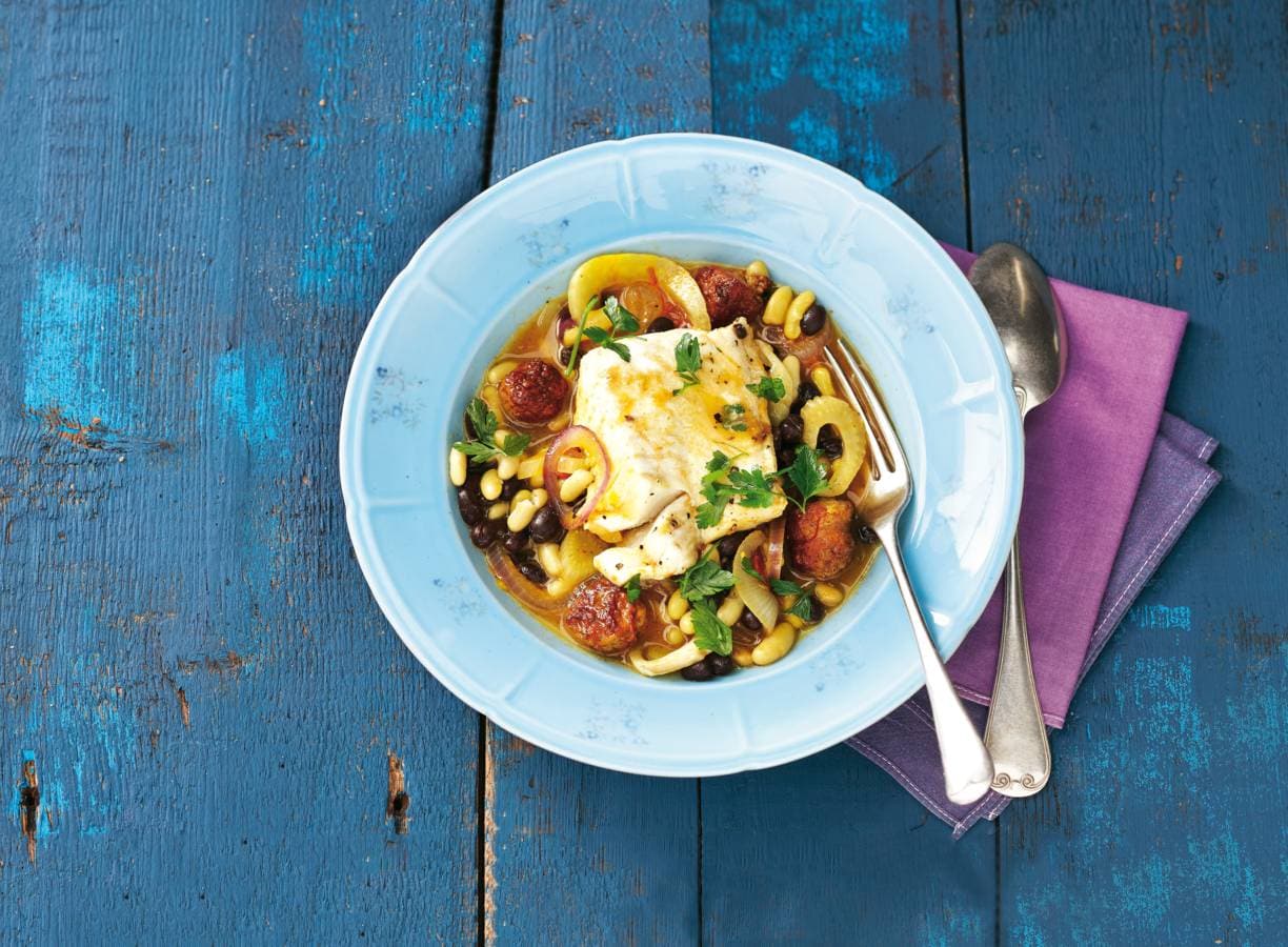 Fruit de knoflook met de uien 3 min. in het achtergebleven bakvet. Voeg de saffraan en venkel toe en bak 5 min. mee. Voeg de tomaten en alle bonen toe. Laat op laag vuur met de deksel op de pan 10 min. stoven. Doe de worst terug in de pan en schep om. Breng op smaak met peper en zout.