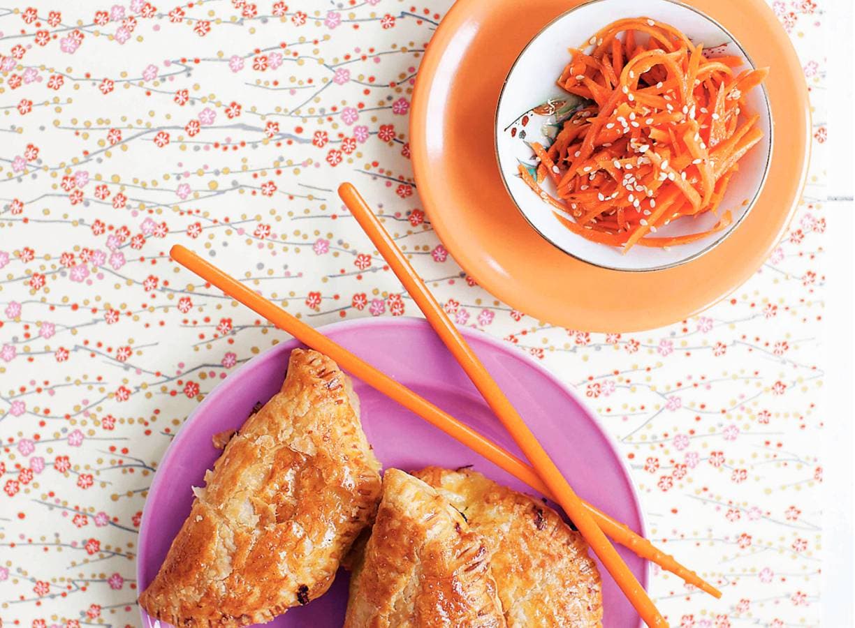 Klop de eidooier los. Snijd de hoeken van de bladerdeegplakjes, zodat er cirkels ontstaan. Verdeel de kip erover en vouw dubbel. Druk met een vork de randen goed dicht. Bestrijk de pasteitjes met de eidooier. Leg op een met bakpapier beklede bakplaat en bak in ca. 25 min. bruin in de oven.