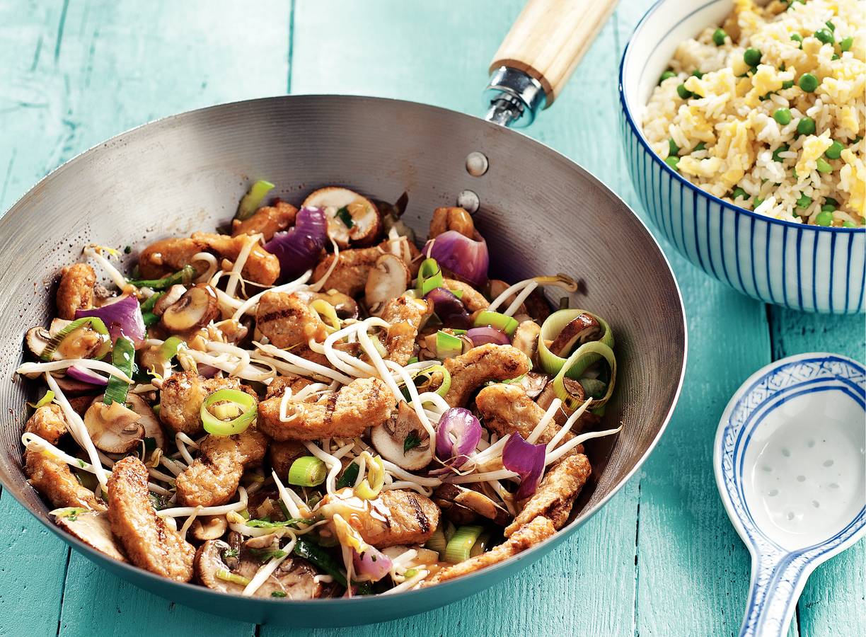 Kook de rijst volgens de aanwijzingen op de verpakking. Giet af en meng met de bevroren tuinerwten. Laat met de deksel op de pan staan. Verhit de helft van de olie in een wok en bak de roerbakmix 4 min. op hoog vuur. Voeg de gegrilde stukjes toe en bak 2 min. mee. Doe de taugé en woksaus erbij en houd op laag vuur warm.