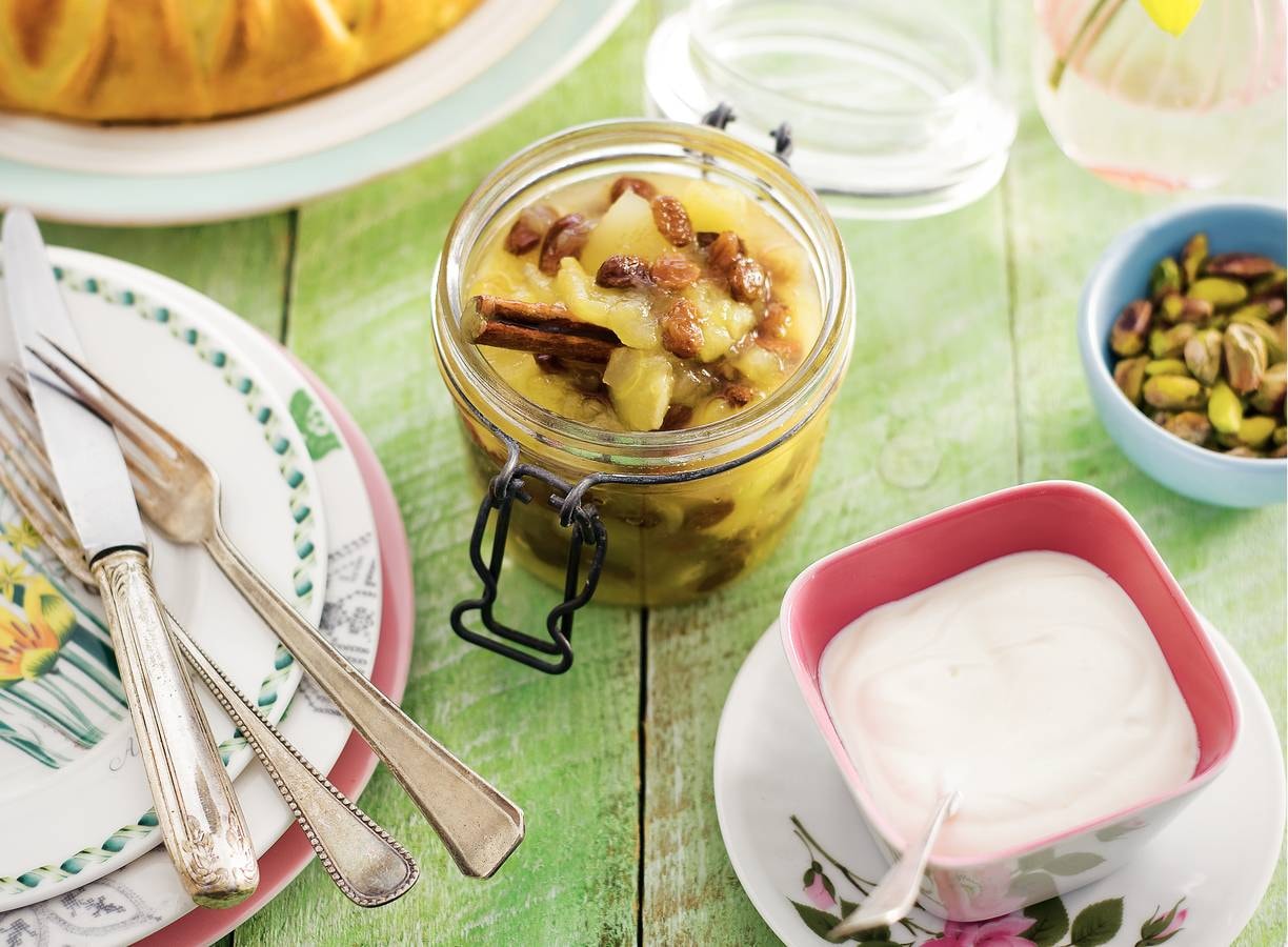 Leg ondertussen het brood 5 min. in de oven om het op te warmen. Snijd in 8 stukken. Verdeel het brood, de compote en hangop over 4 borden en bestrooi met de pistachenoten.