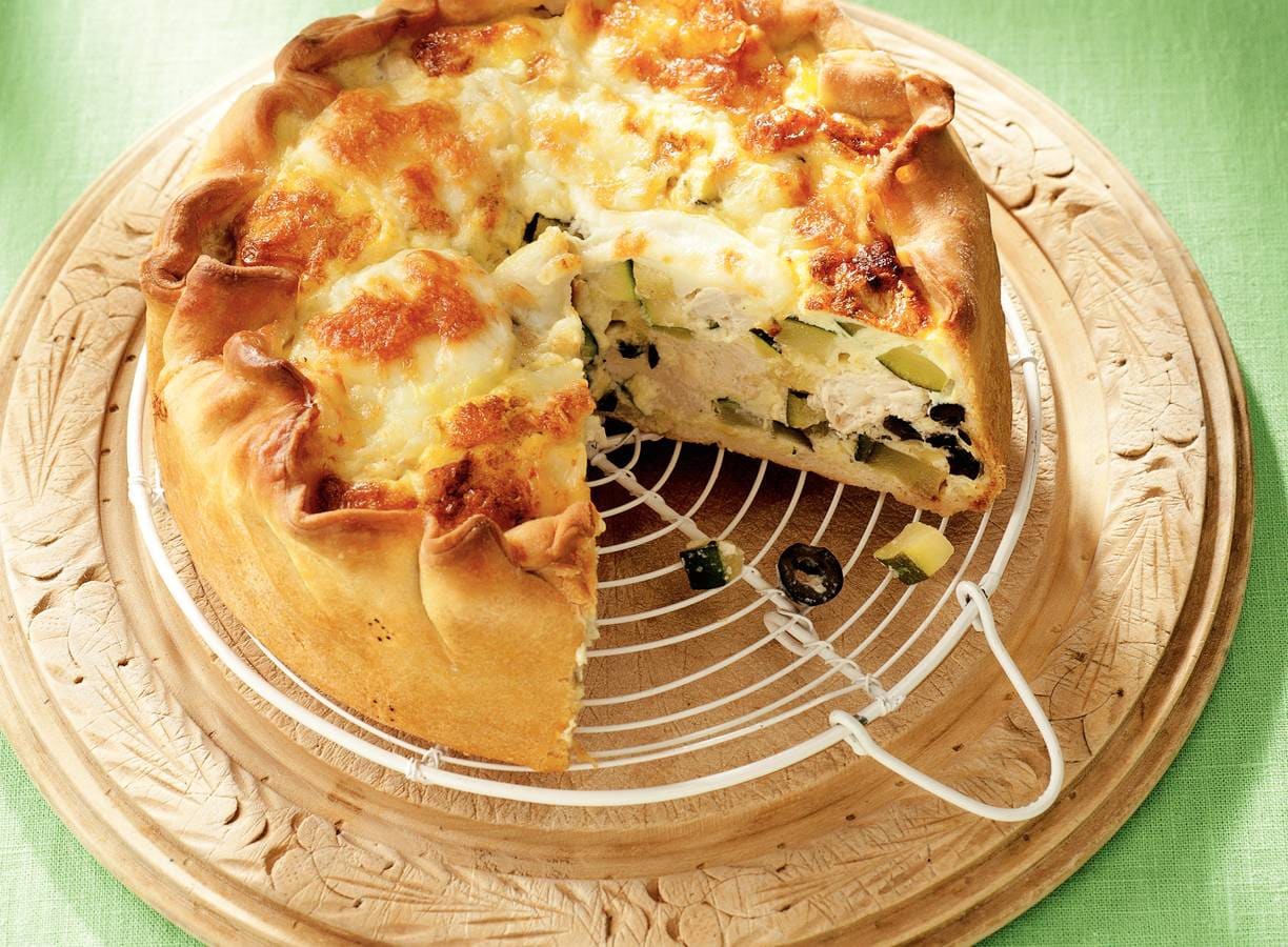 Snijd de courgette in blokjes en de kipfilet in stukjes. Verhit de olie in een koekenpan en bak de kipfilet 3 min. Voeg de courgette toe en bak 5 min. mee. Schep in de vorm.