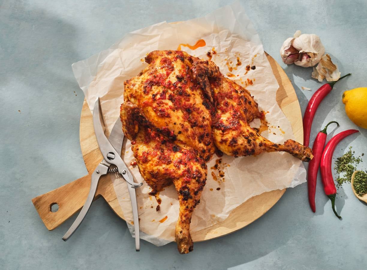 Verwijder het elastiek van de kip en leg met de borstzijde naar beneden. Knip met een wildschaar de ruggengraat eruit. Dit deel gebruik je niet, maar kun je wel gebruiken om bouillon van te trekken. Je kunt het tot gebruik invriezen. Klap de kip open en leg met de borstkant naar boven. Bestrijk de binnen- en buitenkant met ⅔ van de saus en leg in een ovenschaal of braadslee. Zet 2 uur in de koelkast.