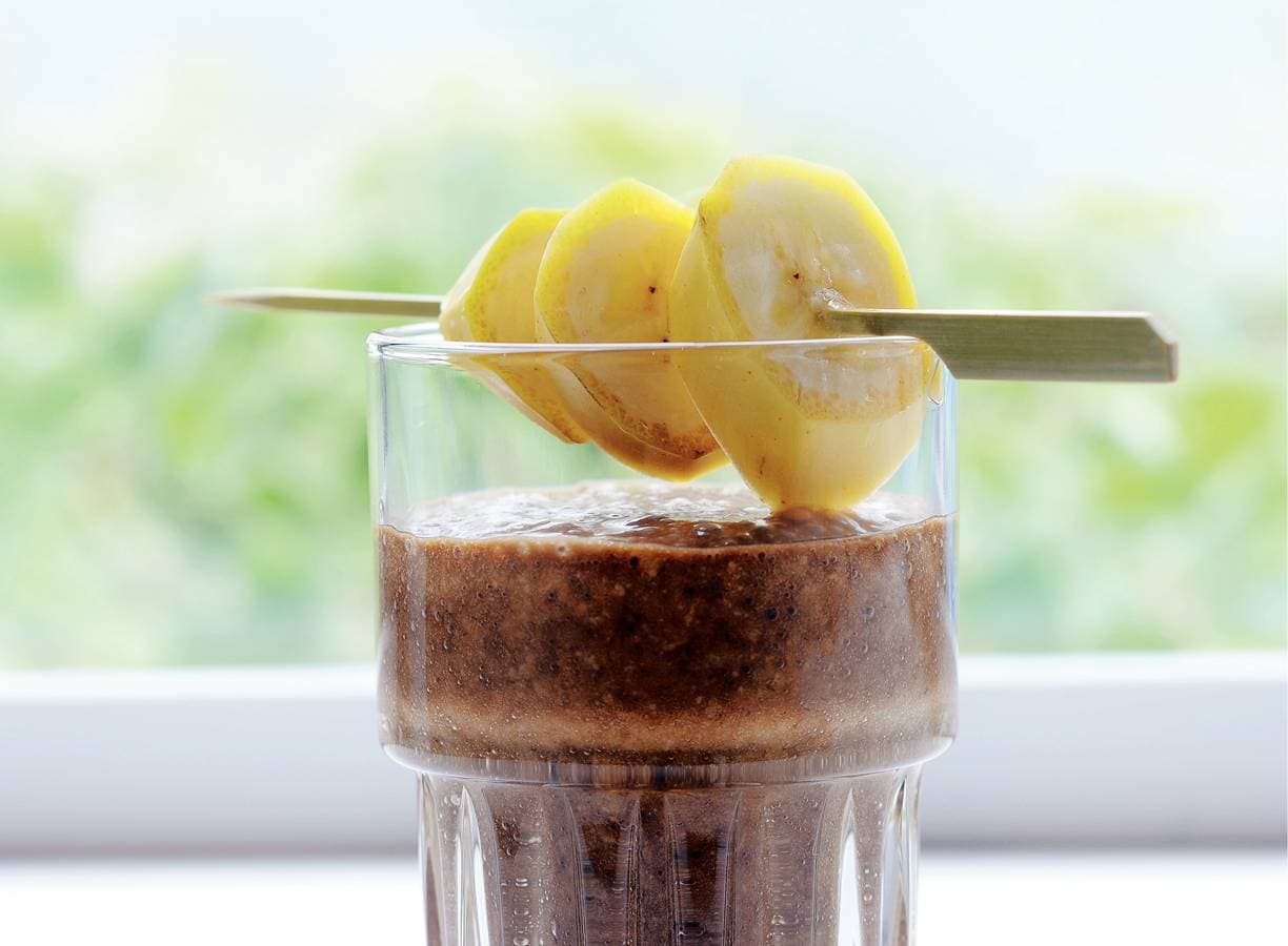 Verdeel de smoothie over 4 glazen en garneer met een plakje banaan.