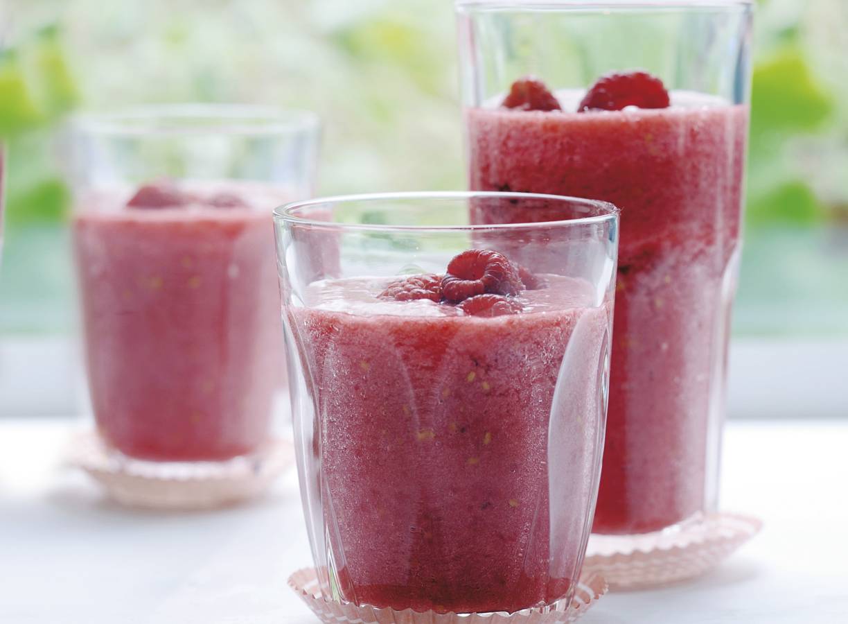 Halveer de grapefruits en pers ze uit. Houd 12 frambozen achter. Doe de rest met de banaan, het ijs en grapefruitsap in de blender of keukenmachine. Mix in 30 sec. tot een smoothie. Verdeel de smoothie over 4 glazen en doe in elk glas 3 frambozen.