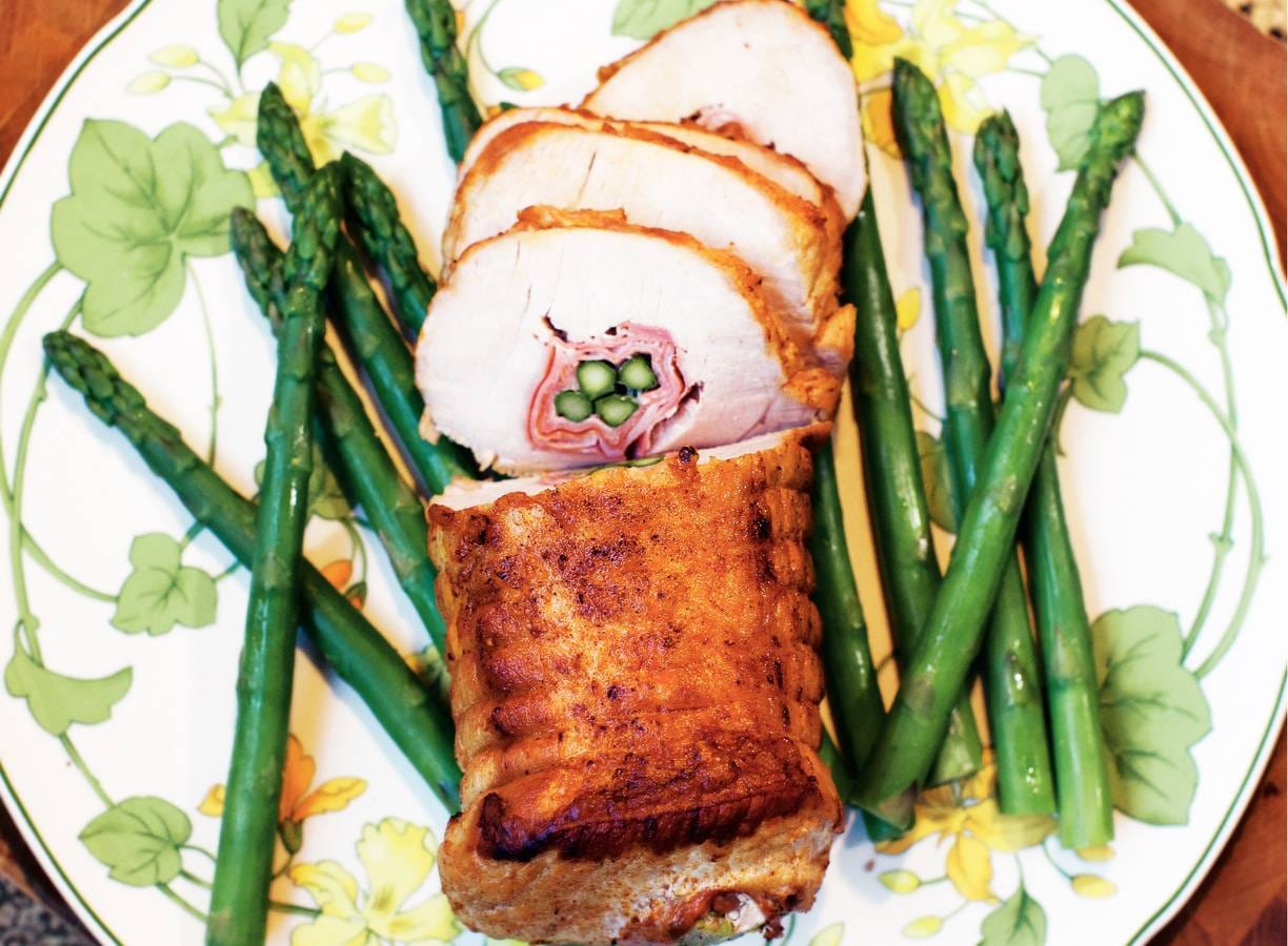 Laat de rollade uit de oven 10 min. rusten met de deksel op de pan. Verwijder het touw en snijd in plakken. Serveer met de rest van de asperges.