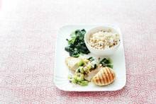 Dep ondertussen de kip droog en bestrijk dun met 2 el olie. Verhit de grillpan en gril de kip in 12 min. gaar. Keer regelmatig. Verhit 2 el olie in een wok. Voeg de spinazie in delen toe en laat slinken. Breng op smaak met peper en zout. Verdeel de spinazie en kip over 4 borden. Schep de kiwisalsa over de kip en serveer met de rijst.
