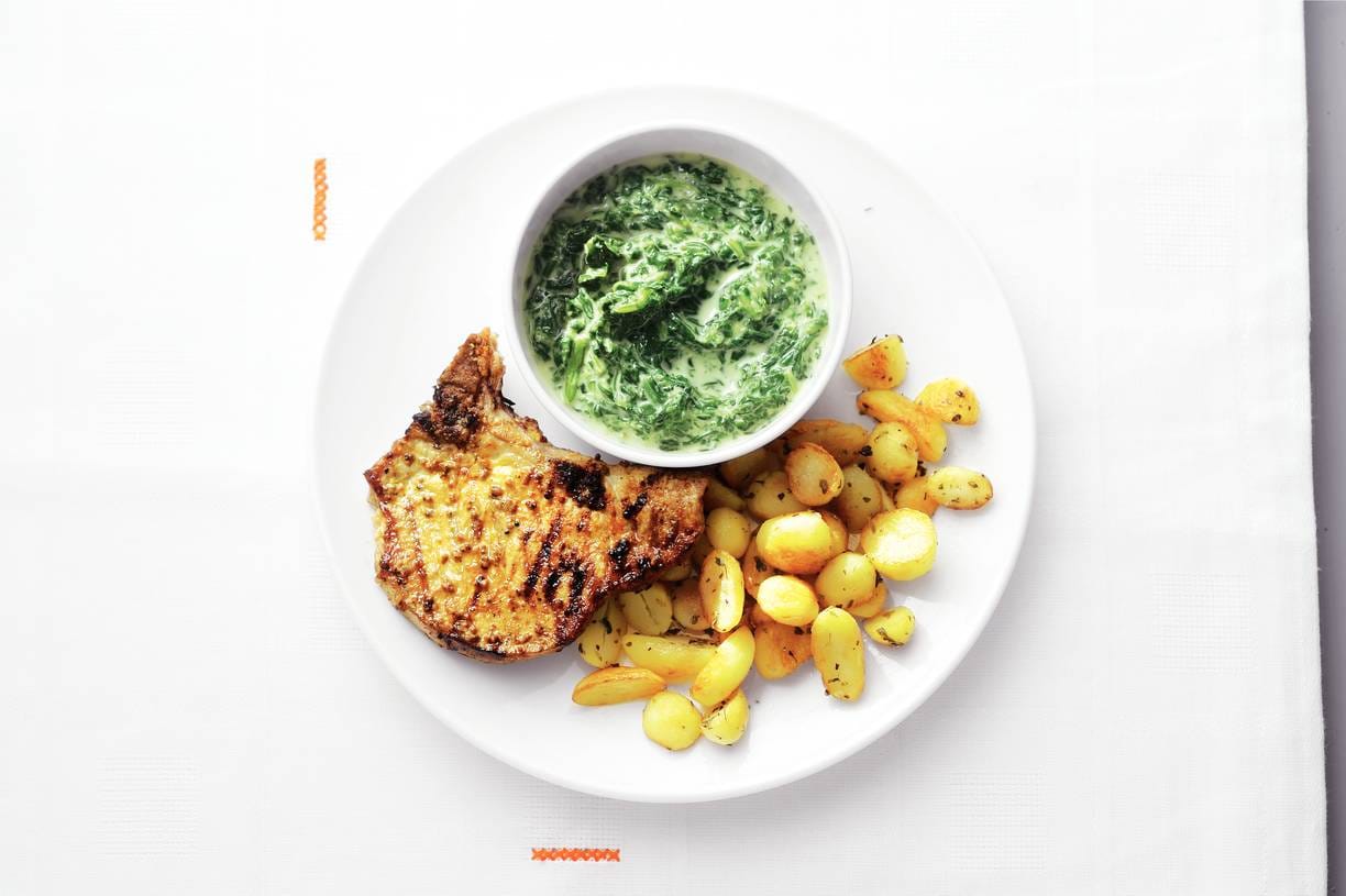 Verwarm ondertussen de spinazie op laag vuur. Serveer de karbonades met de spinazie en krieltjes.