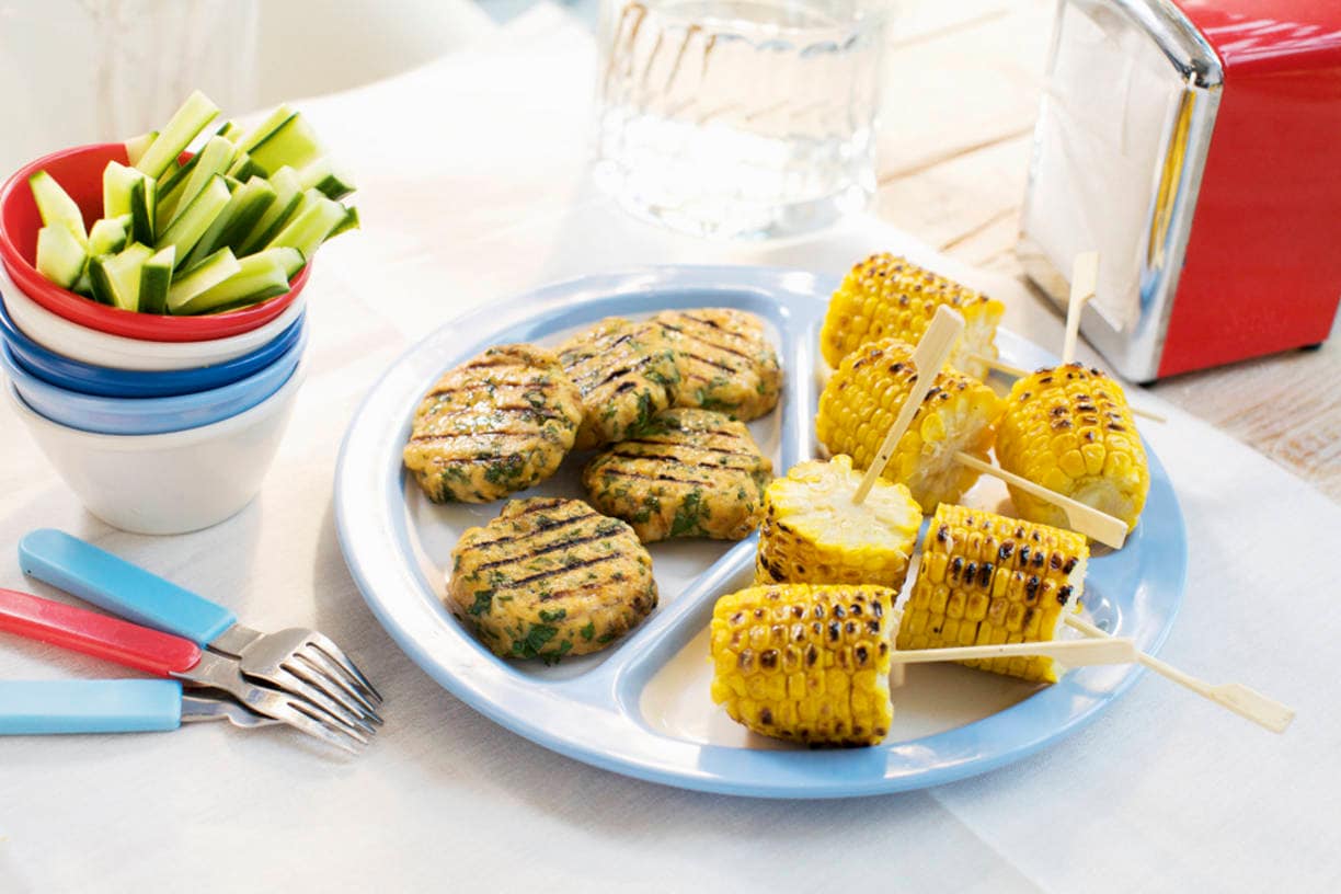 Bestrijk met de roomboter en bestrooi met wat zout. Snijd de mais in stukken en steek er een tapasprikker in.