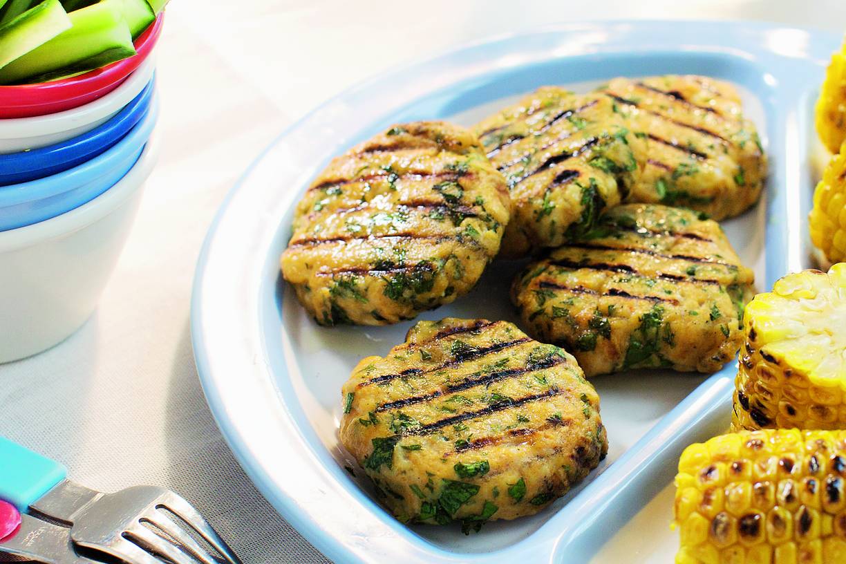 Snijd de kip in stukjes. Maal met het ei, de kruidenmix en 2 el olie fijn in de keukenmachine. Voeg de peterselie toe. Maak er met vochtige handen 12 balletjes van. Druk een beetje plat tot burgertjes. Leg ze op een bord, afgedekt met vershoudfolie, 1 uur in de koelkast. Dan worden ze wat steviger.