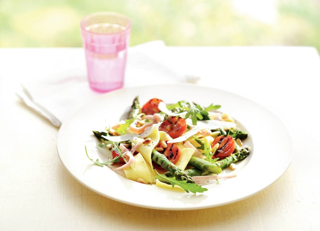 Snijd de asperges in stukken. Meng ze samen met de tomaatjes, ham, rucola en 3 el olie door de pasta. Schaaf de Parmezaanse kaas erover.