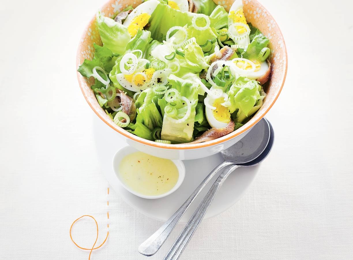 Kook de eieren in 8 min. hard. Laat schrikken en pel ze. Doe de gesneden andijvie in een schaal. Klop in een kom de olijfolie, azijn en mayonaise tot een dressing. Besprenkel de andijvie ermee. Snijd de eieren in parten en leg op de andijvie samen met de ansjovisfilets. Strooi de bosui over de salade. Lekker bij vissticks en gebakken aardappel.