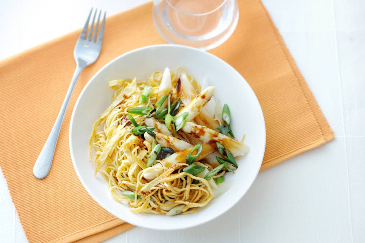 Verhit de rest van de olie in een wok. Roerbak de asperges, sojasaus, sesamolie en gembersiroop 1 min. Schep op de mie. Leg de omeletreepjes erop en bestrooi met de bosui.